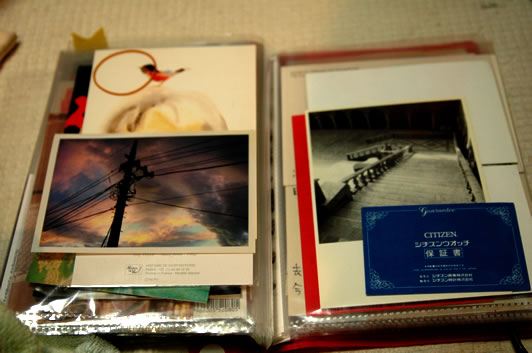 左はいわさきちひろのハガキとキレイな夕方を撮った写真と輪ゴム。右は10年ちかく前にノルウェイに行った時に買ったハガキと2001年の元旦に買った時計の保証書。
