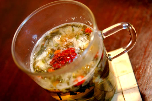 お仕事で中国にいったときのお茶だそうです。お花がたくさん浮いていてすごくきれいでした。