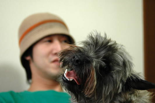 犬のタンクはドラゴンさんが好き。ひざにのっかってる。