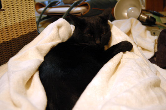 今日はみんな集まってなにしてるんだろう?? と戸惑い気味のネコ。4時をすぎた頃から、さすがにつかれて私の足の上でねてた。