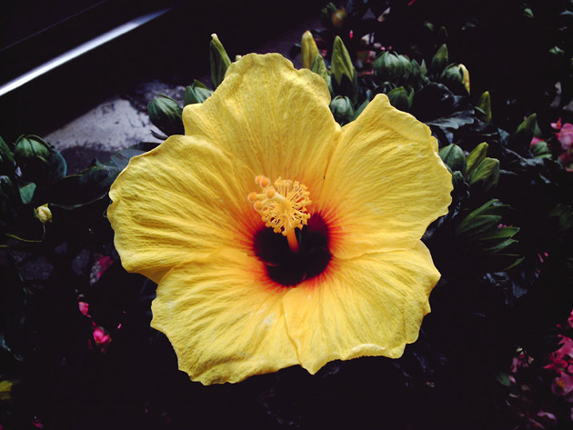 喫煙場所にいた黄色い花。私と同じくぐったりしてたので、ついカメラをむけてしまった。花も副流煙すってるのかな。
