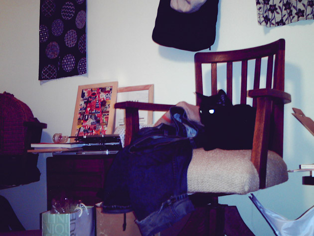 猫、いすのうえ。若干湿度にやられてるようす。人間も猫もぐったり。
