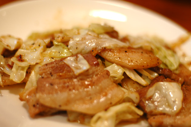 豚バラキャベツとごはんとなすのお味噌汁。うまかった。キャベツおいしい。