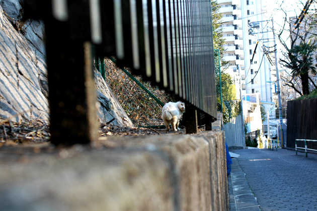 ちらっとふりむく、白い猫。