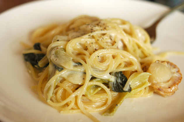 昨日私が失敗した「ホタテと青梗菜のクリーム煮」をお昼ごはんにドラゴンがおいしいパスタにしてくれた。こういうことされるとごはん作るのイヤになっちゃうわよね、実際!