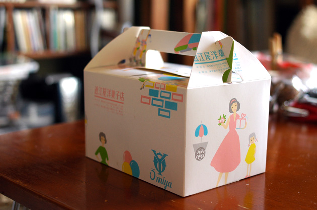 近江屋洋菓子店のケーキの箱。かわいい。かわいんだけど、よくみると変な絵なのが昭和っぽい。