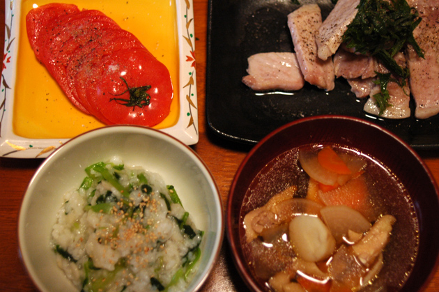 昨日つくれなかった七草がゆを作った。夜おそくに。それと賞味期限ギリギリの塩豚にいつものお雑煮。