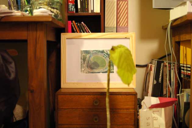 どっぷり疲れて帰ったらゆいちゃんがいなかったので、なんとなく寂しかった。前くんが空撮した広島市民球場の写真を額に入れてかざった。