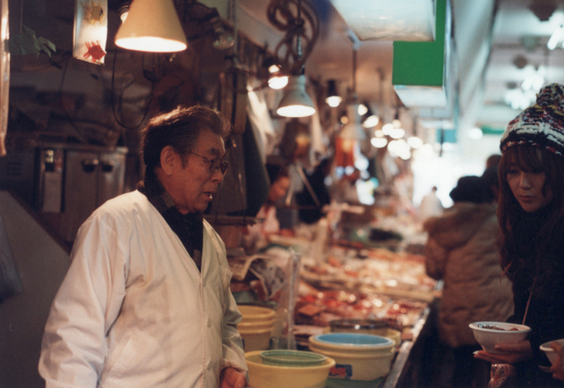 お昼ごはんは古川市場の「のっけ丼」。店をまわって魚介類をごはんの上にのっけて、自分の好きな丼がつくれるというもの。
